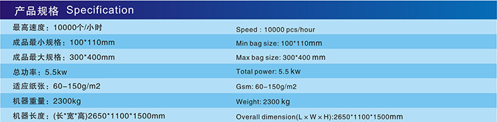 氣吸式紙堆底部給紙機(jī)構(gòu)分紙可靠,并可不停機(jī)續(xù)紙。配有吸氣滾筒的柵欄定位折疊機(jī)構(gòu)高速穩(wěn)定,折疊準(zhǔn)確??刹煌C(jī)調(diào)整信封(紙袋)的寬度,輪轉(zhuǎn)施膠機(jī)構(gòu)可保證膠量均勻,清洗方便,配有成品計(jì)數(shù)分組機(jī)構(gòu)。